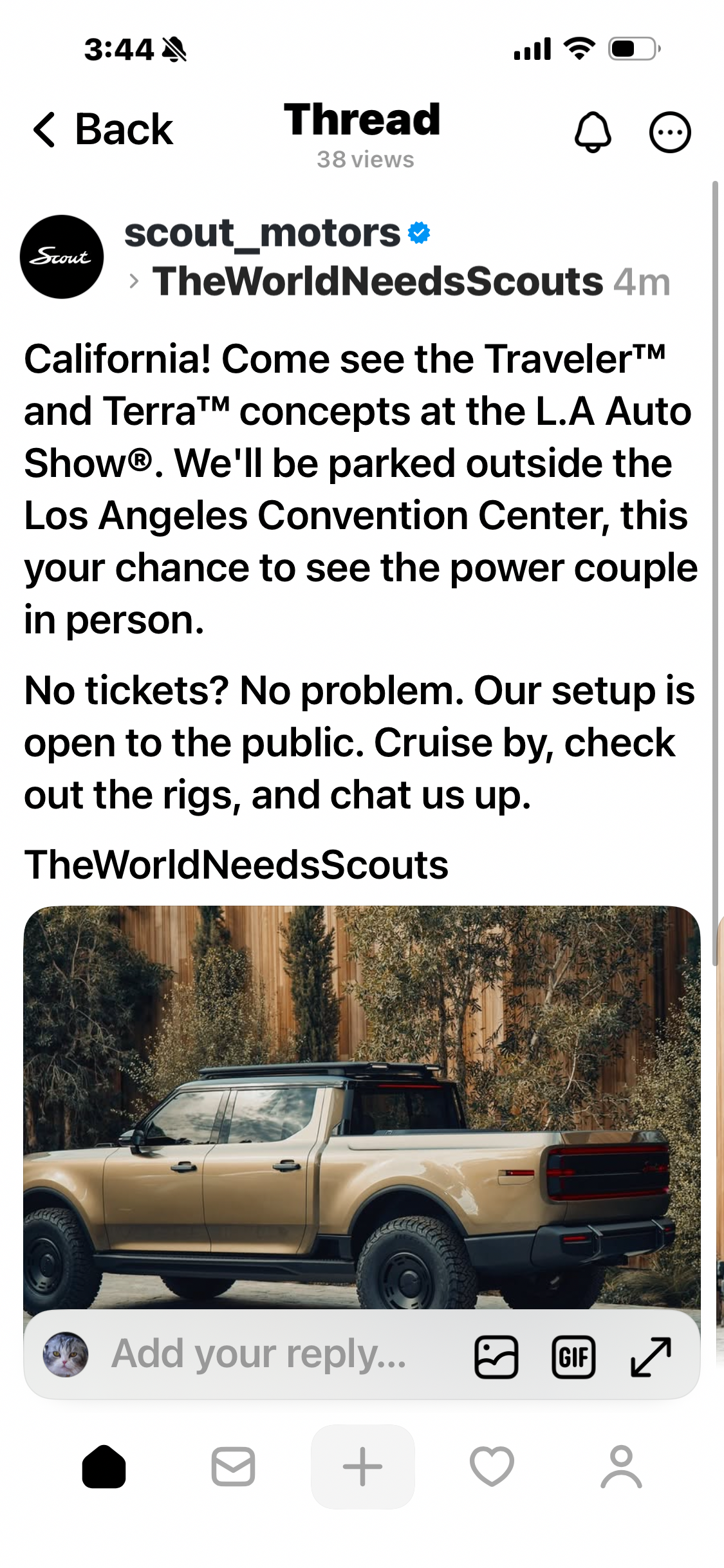 Additionally, Scout Motors wants to hear your feedback and speak directly to the rabid community of owners as unique as America. We'll use the Scout Community to deliver news and information on events and launch updates directly to the group. Although the start of production is anticipated in 2026, many new developments and milestones will occur in the interim. We plan to share them with you on this site and look for your feedback and suggestions.